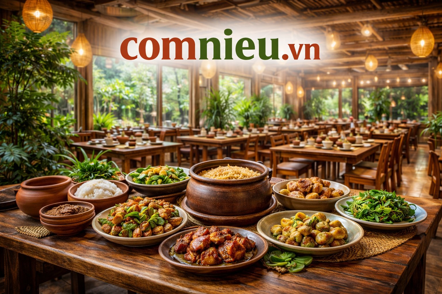 – Quán cơm niêu truyền thống: bàn ghế gỗ, gạch thô, niêu đất trưng bày